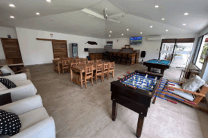 As far as the facility itself, you feel like you’re in a villa. The rooms are clean with TV and strong A/C all surrounding the hot tub and pool (which are are cleaned daily). You walk into the main building and there’s a fully stocked kitchen, gas stove and dining area. We played pool and foosball sat on the patio played games! They have a huge grill so we took one night to grill out and have a family style dinner. It’s very conveniently located, being minutes to downtown and all the food, bars, clubs, etc. Whatever you’re looking for you can find it and pay maybe 3$ for a Uber.