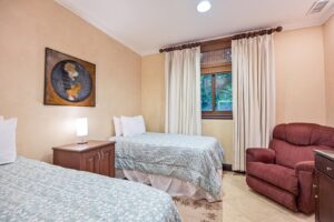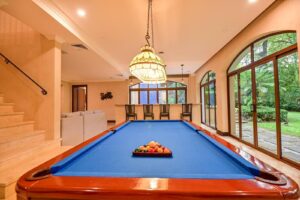 Kings Eco Golf Villa features 7 bedrooms and 6.5 bathrooms across a two-story layout built for both relaxation and entertainment. The open living area flows out through glass doors to a large terrace and freeform pool, creating a seamless indoor-outdoor gathering space. A game room provides additional fun for families and groups, while multiple bedrooms offer comfort and privacy for every guest. Surrounded by rainforest views, the pool and patio make the perfect setting for sunset cocktails, alfresco dining, or lounging with loved ones. With its blend of privacy, luxury, and access to resort amenities, this villa is an ideal home base for your Costa Rica getaway.