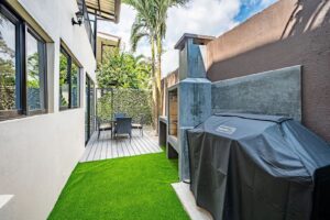 Private Backyard Patio: Outdoor shower, BBQ grill, chairs & greenery.