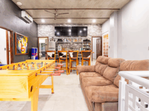 As far as the facility itself, you feel like you’re in a villa. The rooms are clean with TV and strong A/C all surrounding the hot tub and pool (which are are cleaned daily). You walk into the main building and there’s a fully stocked kitchen, gas stove and dining area. We played pool and foosball sat on the patio played games! They have a huge grill so we took one night to grill out and have a family style dinner. It’s very conveniently located, being minutes to downtown and all the food, bars, clubs, etc. Whatever you’re looking for you can find it and pay maybe 3$ for a Uber.