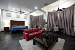 As far as the facility itself, you feel like you’re in a villa. The rooms are clean with TV and strong A/C all surrounding the hot tub and pool (which are are cleaned daily). You walk into the main building and there’s a fully stocked kitchen, gas stove and dining area. We played pool and foosball sat on the patio played games! They have a huge grill so we took one night to grill out and have a family style dinner. It’s very conveniently located, being minutes to downtown and all the food, bars, clubs, etc. Whatever you’re looking for you can find it and pay maybe 3$ for a Uber.