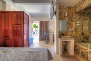 - Apartment 2: Queen bed, en-suite bathrooms and bathtubs, and equipped with a kitchen 1 sofa bed.