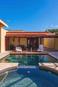 Kings Jaco Sol is a versatile property consisting of three units: the main house and two private apartments, giving groups plenty of space and flexibility. The main house features three bedrooms—two master suites with king-size beds and en-suite bathrooms (one with a private hot tub), plus a third bedroom with a queen cabin bed that sleeps up to four, also with its own bathroom. A spacious living room with a kitchenette flows into a covered patio, creating the perfect spot for group meals or evening gatherings. The two apartments provide additional accommodations, each equipped with bedrooms, bathrooms, and living areas for added privacy. Guests will enjoy modern amenities, air conditioning, and thoughtful touches throughout the home, making it an inviting base for any Costa Rica vacation. With multiple living spaces, secure surroundings, and a layout designed for both connection and privacy, Kings Jaco Sol is ideal for family vacations, reunions, or small group getaways.